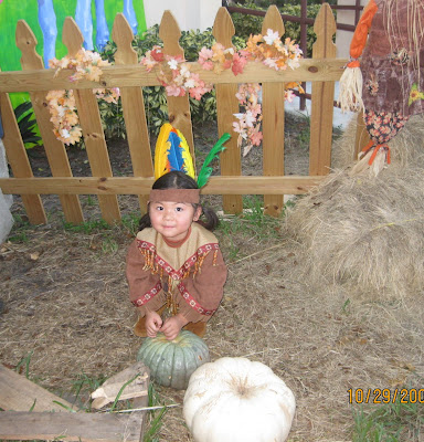Halloween is not my favorite holiday but seeing the smiles on the faces of my children makes all the crazy running around worth it. Why is is that the simplest of holidays come along with so much work? The week started off with Danny having car trouble, and then Michelle getting sick and having to go to the doctor for a strep test. She didn't require antibiotics but the doctor did say she was suffering from exhaustion. I'm still trying to keep up with my own job while I help Michelle with her studio in the evenings. I did get to finish Leah's costume and Michelle put her costume together and I thought I we were done. Suddenly Michelle learns she needs yet another costume for a party she was going to later. Nancy Drew was great for trick or treating with Leah and the cousins but not sophisticated enough for clubbing with friends later. So the search goes on for the perfect costume. We find it and here it is the day before Halloween and all costumes and accessories are in order. Danny was not doing anything this year as he decided to spend Saturday working on his very neglected car. Then I remember I better get to the pumpkin patch right after Leah's speech therapy for some pictures before they are out pf pumpkins. Well is was empty but I did manage to get some pictures with the costume. Our little Pocahontas was a hit at the pumpkin patch.